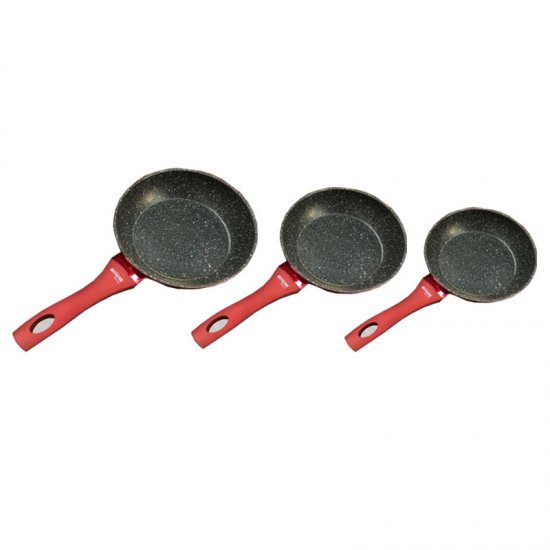 Τηγάνια: Ø20cm, Ø24cm, Ø28cm, Η σειρά δοχείων και αξεσουάρ AIWA είναι κατασκευασμένα από σφυρήλατο αλουμίνιο υψηλής ποιότητας, καλυμμένα εσωτερικά με επίστρωση τριπλού γρανίτη (μάρμαρο) με πολύ υψηλό συντελεστή σκληρότητας. Η εξωτερική επίστρωση διατίθεται σε πολλά χρώματα με χαρακτηριστική μεταλλική γυαλάδα. Εργονομική, μαλακή λαβή. Κατάλληλη για όλους τους τύπους κουζινών: αερίου, ηλεκτρική, κεραμική, αλογόνου, επαγωγική.